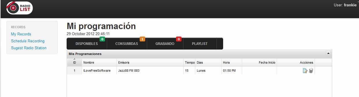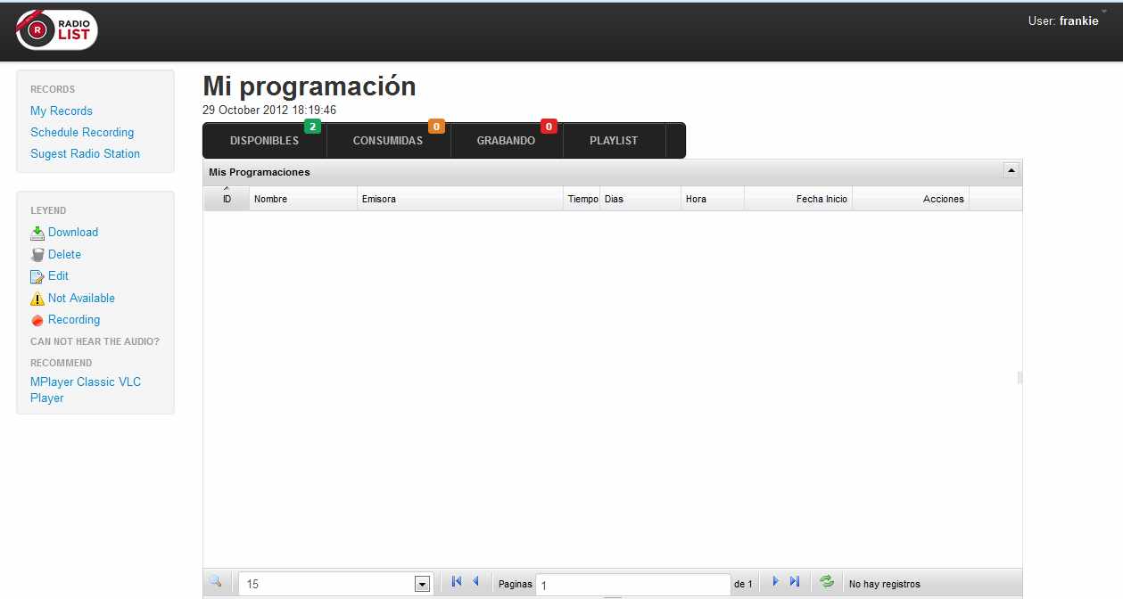 Apa yang Anda lihat pada gambar di atas adalah antarmuka standar yang menunggu untuk Anda setelah mendaftar dan login ke panel kontrol dari layanan radio bebas Rlist.net rekaman online.