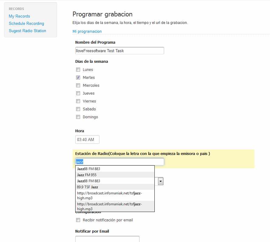 Di sini Anda harus memasukkan nama tugas, hari ketika Anda ingin menjalankannya, waktu, dan yang paling penting dari semua akan menjadi Stasiun Radio kotak input, yang ketiga dari atas di mana Anda harus memasukkan nama dari stasiun radio yang Anda tertarik dalam rekaman. Mulai mengetik beberapa huruf pertama dan jika radio didukung akan muncul. Pada gambar di atas kita cari "jazz" dan stasiun jazz dari database telah muncul di daftar. Di bawah masuk ke Twitter atau Email jika Anda ingin diberitahu ketika rekaman selesai, setelah selesai klik Add.